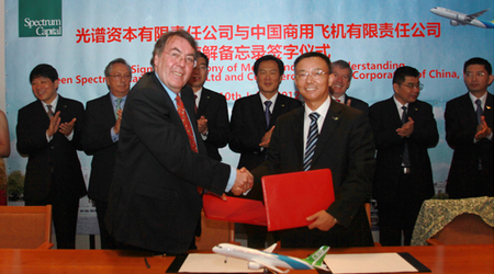 中國經(jīng)濟(jì)網(wǎng)訊 2012年7月10日,范堡羅航展第二天,中國商飛公司與光譜資本有限責(zé)任公司(以下簡(jiǎn)稱光譜公司)在英國倫敦簽署諒解備忘錄。