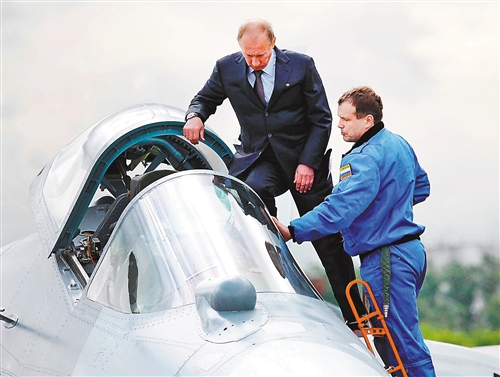 俄羅斯首都莫斯科市郊外的茹科夫城,普京(左)參觀由俄羅斯蘇霍伊公司研制的第五代隱形戰(zhàn)斗機(jī)T-50。 新華社發(fā)