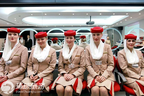在迪拜的阿聯(lián)酋航空學(xué)院的教室里,空姐們身著制服,姿勢統(tǒng)一,形象俏麗宜人!