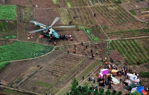 成都軍區(qū)空軍出動(dòng)直升機(jī)對寶盛鄉(xiāng)進(jìn)行大規(guī)模空運(yùn)空投(曹憶楠 攝)