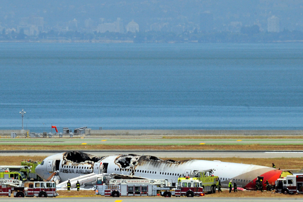 2013年7月6日,在美國舊金山國際機(jī)場,救援人員在發(fā)生事故的波音777飛機(jī)旁工作。