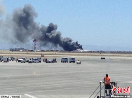 一架韓亞航空公司的波音777型客機(jī)當(dāng)?shù)貢r(shí)間7月6日11點(diǎn)半在美國(guó)舊金山國(guó)際機(jī)場(chǎng)著陸時(shí)失事,機(jī)尾折斷,引發(fā)大火,并導(dǎo)致數(shù)十人傷亡。圖為失事現(xiàn)場(chǎng)濃煙滾滾。