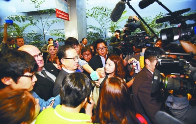 韓亞航空公司社長(zhǎng)尹永斗(中左)抵達(dá)美國(guó)舊金山國(guó)際機(jī)場(chǎng)后接受媒體采訪。新華社/路透