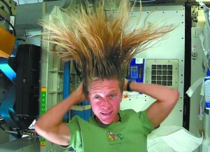 卡倫擁有一頭過肩長發(fā),在太空里這些頭發(fā)全都豎了起來,顯得“怒發(fā)沖冠”。在國際空間站里,水不會像地球上那樣從高往低流,而是會變成無數(shù)小水珠到處亂飄。