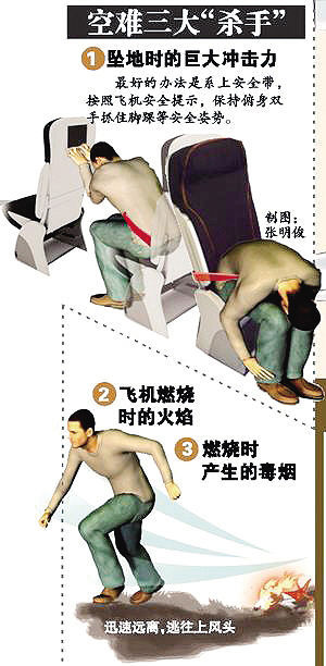 所謂飛機的“黑色10分鐘”,是指絕大多數(shù)空難都發(fā)生在飛機起飛階段的3分鐘與著落階段的7分鐘。但事故一旦發(fā)生,留給機上旅客的逃生時間遠(yuǎn)沒有3分鐘、7分鐘這么長。業(yè)內(nèi)人士認(rèn)為,失事后一分半鐘內(nèi)是逃生的“黃金時間”。此時無論是一個常識的錯誤或是設(shè)備使用的不熟練都足以致命。