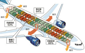 英國民航局委托、由格林威治大學(xué)實施的研究顯示,飛機上逃生可能性最大的座位是對著緊急出口的那排座位和緊急出口前面及后面的一排座位。最危險的座位是距離緊急出口6排和更遠(yuǎn)的座位。該研究表示:坐在飛機前面的乘客,從火災(zāi)中安全逃生的可能性是65%,而坐在飛機后面的乘客逃生的可能性僅為53%。坐在過道里的乘客從火災(zāi)中安全逃生的可能性是64%,而其他乘客在這種情況下安全逃生的可能性僅為58%。
