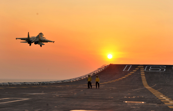 9月15日,殲—15艦載戰(zhàn)斗機(jī)成功完成最大重量起降試驗(yàn)。圖為觸艦復(fù)飛的殲—15艦載戰(zhàn)斗機(jī)! 垊P攝