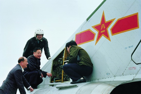 殲-8飛機0102號機試飛中,顧誦芬與飛行員和技術人員一起研究排除故障!