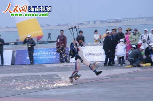 17日上午,2011環(huán)海南飛行拉力賽在海口舉行了隆重的開幕儀式。直升機同心圓旋轉(zhuǎn)、模型機超低空飛行、跳傘隊上演“七仙女下凡”……八一跳傘隊、河南跳傘隊、翱翔中國航空模型特技飛行表演隊等在萬綠園旁人工島上演了一場華麗的飛行表演秀,一系列超乎想象的精彩表演讓現(xiàn)場觀眾嘆為觀止。