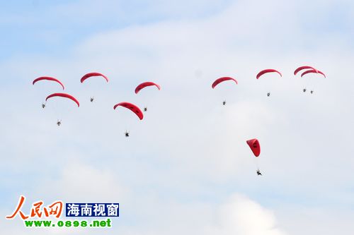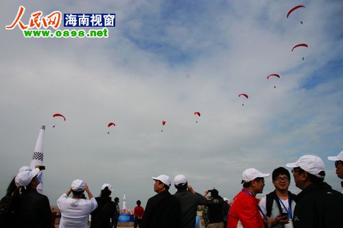 21日上午8點左右,經(jīng)過一天的休整,2011環(huán)海南島飛行拉力賽東方段在東方市邊貿(mào)城正式開幕。比起前幾日的大風(fēng)天氣,今天的風(fēng)速明顯減弱,在?谖茨芘c廣大市民和游客見面的熱氣球、動力傘、動力三角翼今天也終于如愿升空,在東方的碧海藍天間盡情的翱翔。大批東方市民趕到現(xiàn)場,一幕幕精彩的飛行表演引得現(xiàn)場尖叫連連、掌聲不斷。