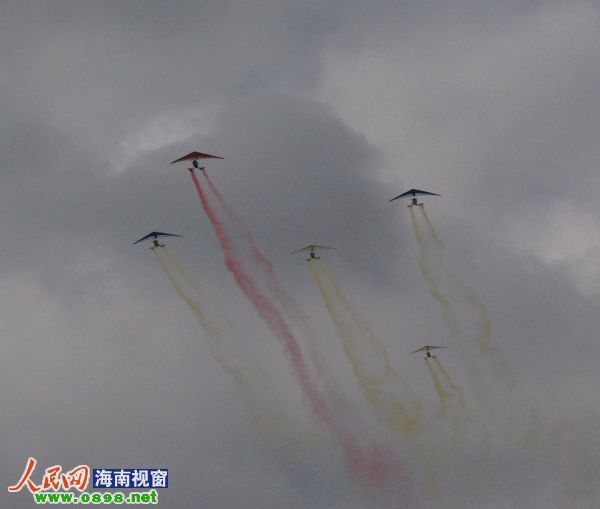 29日的萬寧晴空萬里,飛行特技運動員們早早便做好了準備,熱氣球、動力滑翔傘、三角翼、航空模型等飛行器材也準備完畢,早上10點,隨著歡樂的音樂響起,率先飛過場地的是捧著彩帶的三角翼編隊。