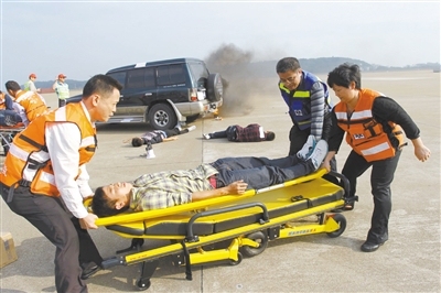 隨后,人員疏散時(shí)出現(xiàn)踩踏現(xiàn)象,救護(hù)車因道路擁堵無(wú)法將傷員送往附近醫(yī)院救治,交通運(yùn)輸部南海第一救助飛行隊(duì)使用直升機(jī)將傷員運(yùn)往市區(qū)救治,聞?dòng)嵍鴣?lái)的傳媒和群眾急切要求公布傷亡人員名單和事故真相,海事部門搜救落水飛行員,特種設(shè)備部門調(diào)查墜機(jī)原因,有關(guān)部門三度召開(kāi)新聞發(fā)布會(huì)并采用微博等方式及時(shí)公布信息……演練指揮人員沉著應(yīng)對(duì),各救援組協(xié)同作戰(zhàn)。