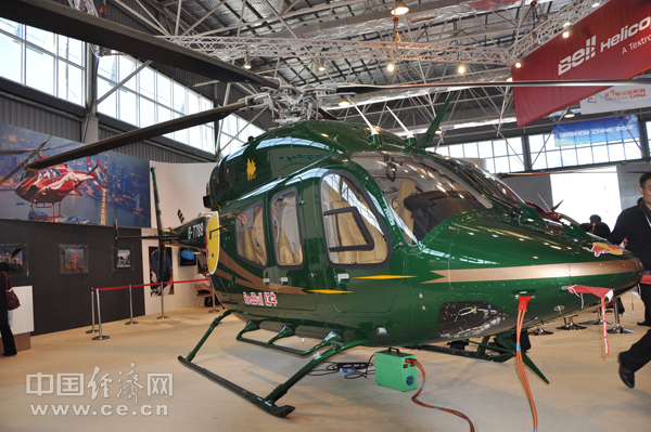 貝爾直升機(jī)公司展臺(tái)的直升機(jī) 中國(guó)經(jīng)濟(jì)網(wǎng)記者 段丹峰 攝