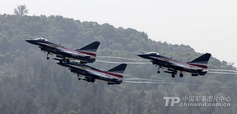 第9屆中國航空航天博覽會開幕在即。中國人民解放軍空軍八一飛行表演隊已到達(dá)珠海機場。 11月10日,珠海機場多云,八一飛行表演隊的飛行健兒進行了“熱身訓(xùn)練”。記者在現(xiàn)場記錄了他們駕駛殲10戰(zhàn)機在云中穿梭的情景。親眼見證 “三機箭隊起飛”、“4機菱形隊斤頭”、“5、6號機繞軸滾轉(zhuǎn)”、“4機菱形放起落架斜盤旋”、“4機疊羅漢”等新增的高難度動作的風(fēng)采。(來源:中國軍網(wǎng))