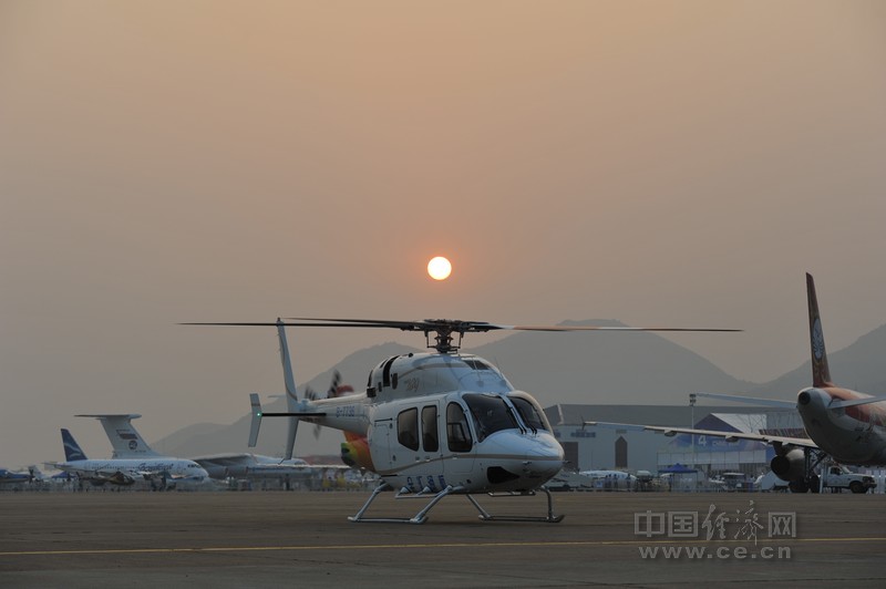中國(guó)經(jīng)濟(jì)網(wǎng)珠海航展特派記者團(tuán)記者王飛 11月15日?qǐng)?bào)道 金匯通航貝爾直升機(jī)在珠海航展上做展示飛行。