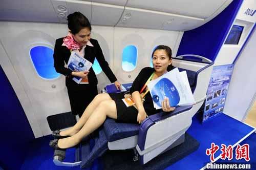 5月29日,日本全日空航空公司(ANA)在首屆中國(北京)國際服務(wù)貿(mào)易交易會(“京交會”)上展示該公司訂購的全球首架波音787“夢想客機(jī)”的模擬客艙,參觀者可以親身體驗(yàn)舒適的座椅。(圖:侯宇攝)