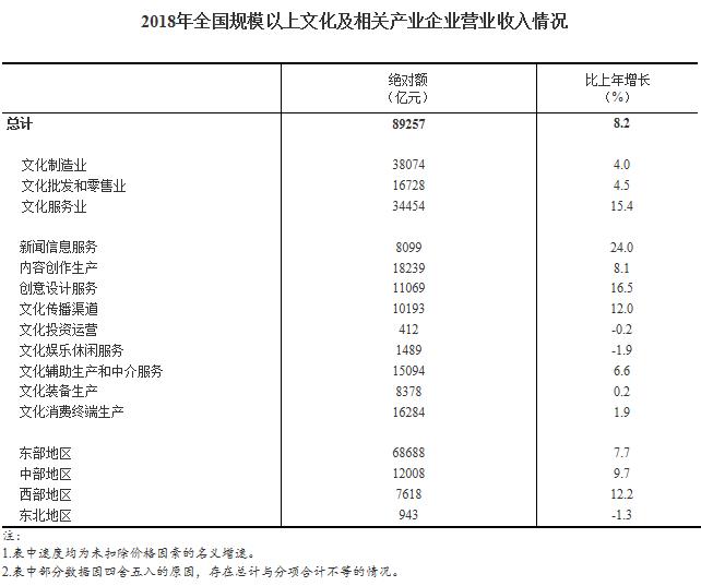 經(jīng)濟(jì)日報(bào)-中國經(jīng)濟(jì)網(wǎng)北京1月31日訊 今天,國家統(tǒng)計(jì)局公布了2018年規(guī)模以上文化及相關(guān)產(chǎn)業(yè)生產(chǎn)經(jīng)營季度報(bào)告。報(bào)告顯示,據(jù)對全國規(guī)模以上文化及相關(guān)產(chǎn)業(yè)6.0萬家企業(yè)調(diào)查,2018年,上述企業(yè)實(shí)現(xiàn)營業(yè)收入89257億元,比上年增長8.2% (按可比口徑計(jì)算。為名義增長,未扣除價(jià)格因素。按照《文化及相關(guān)產(chǎn)業(yè)分類(2018)》新標(biāo)準(zhǔn)測算,上述企業(yè)2017年實(shí)現(xiàn)的營業(yè)收入為82456億元。)。