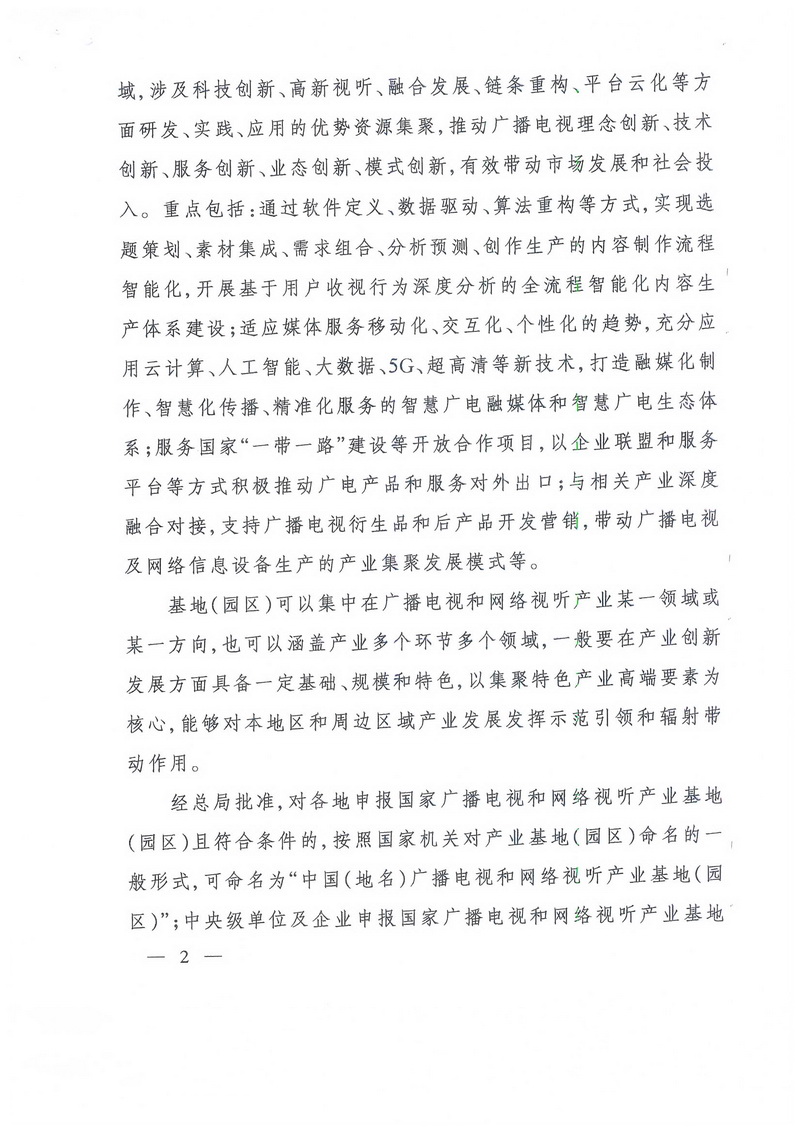 國家廣播電視和網(wǎng)絡(luò)視聽產(chǎn)業(yè)基地(園區(qū))由國家廣播電視總局(以下簡稱“總局”)命名,主要體現(xiàn)在廣播電視和網(wǎng)絡(luò)視聽內(nèi)容制作、分發(fā)傳播、用戶服務(wù)、技術(shù)支撐、生態(tài)建設(shè)以及運營管理等領(lǐng)域,涉及科技創(chuàng)新、高新視聽、融合發(fā)展、鏈條重構(gòu)、平臺云化等方面研發(fā)、實踐、應(yīng)用的優(yōu)勢資源集聚,推動廣播電視理念創(chuàng)新、技術(shù)創(chuàng)新、服務(wù)創(chuàng)新、業(yè)態(tài)創(chuàng)新、模式創(chuàng)新,有效帶動市場發(fā)展和社會投入。重點包括:通過軟件定義、數(shù)據(jù)驅(qū)動、算法重構(gòu)等方式,實現(xiàn)選題策劃、素材集成、需求組合、分析預(yù)測、創(chuàng)作生產(chǎn)的內(nèi)容制作流程智能化,開展基于用戶收視行為深度分析的全流程智能化內(nèi)容生產(chǎn)體系建設(shè);適應(yīng)媒體服務(wù)移動化、交互化、個性化的趨勢,充分應(yīng)用云計算、人工智能、大數(shù)據(jù)、5G、超高清等新技術(shù),打造融媒化制作、智慧化傳播、精準(zhǔn)化服務(wù)的智慧廣電融媒體和智慧廣電生態(tài)體系;服務(wù)國家“一帶一路”建設(shè)等開放合作項目,以企業(yè)聯(lián)盟和服務(wù)平臺等方式積極推動廣電產(chǎn)品和服務(wù)對外出口;與相關(guān)產(chǎn)業(yè)深度融合對接,支持廣播電視衍生品和后產(chǎn)品開發(fā)營銷,帶動廣播電視及網(wǎng)絡(luò)信息設(shè)備生產(chǎn)的產(chǎn)業(yè)集聚發(fā)展模式等。