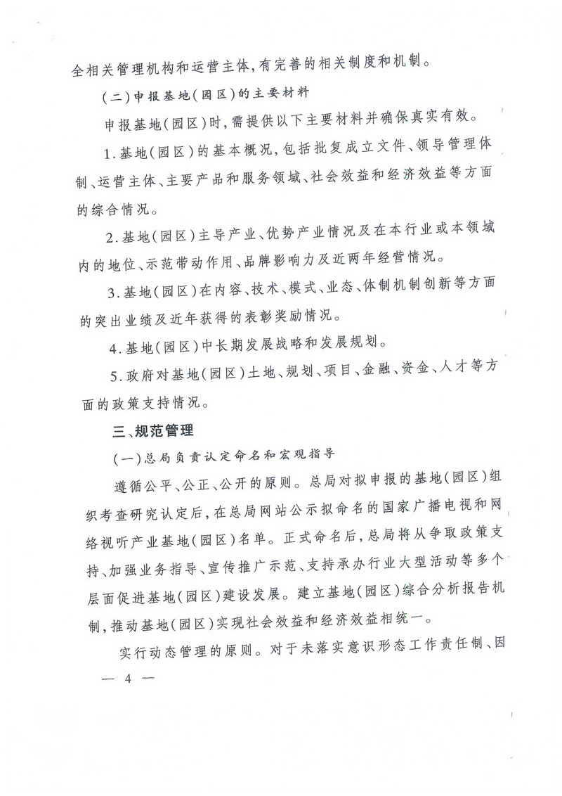 對總局此前已經(jīng)命名的基地(園區(qū)),屬于廣播電視和網(wǎng)絡(luò)視聽方面的,要進(jìn)行全面梳理,按本通知精神納入統(tǒng)籌管理,推動轉(zhuǎn)型升級,并按上述時間要求報送年度發(fā)展情況報告。