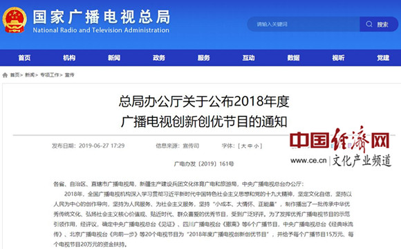 國(guó)家廣播電視總局辦公廳關(guān)于公布2018年度廣播電視創(chuàng)新創(chuàng)優(yōu)節(jié)目的通知