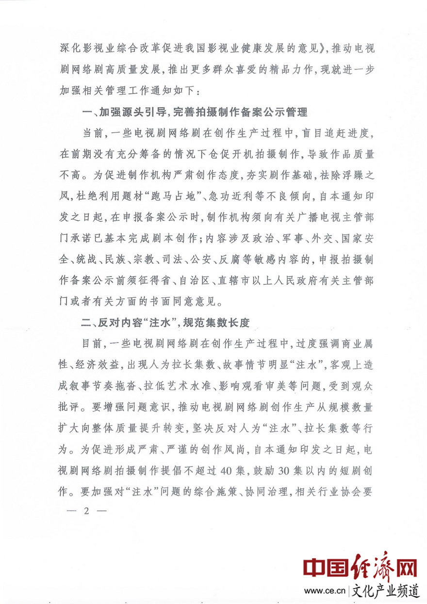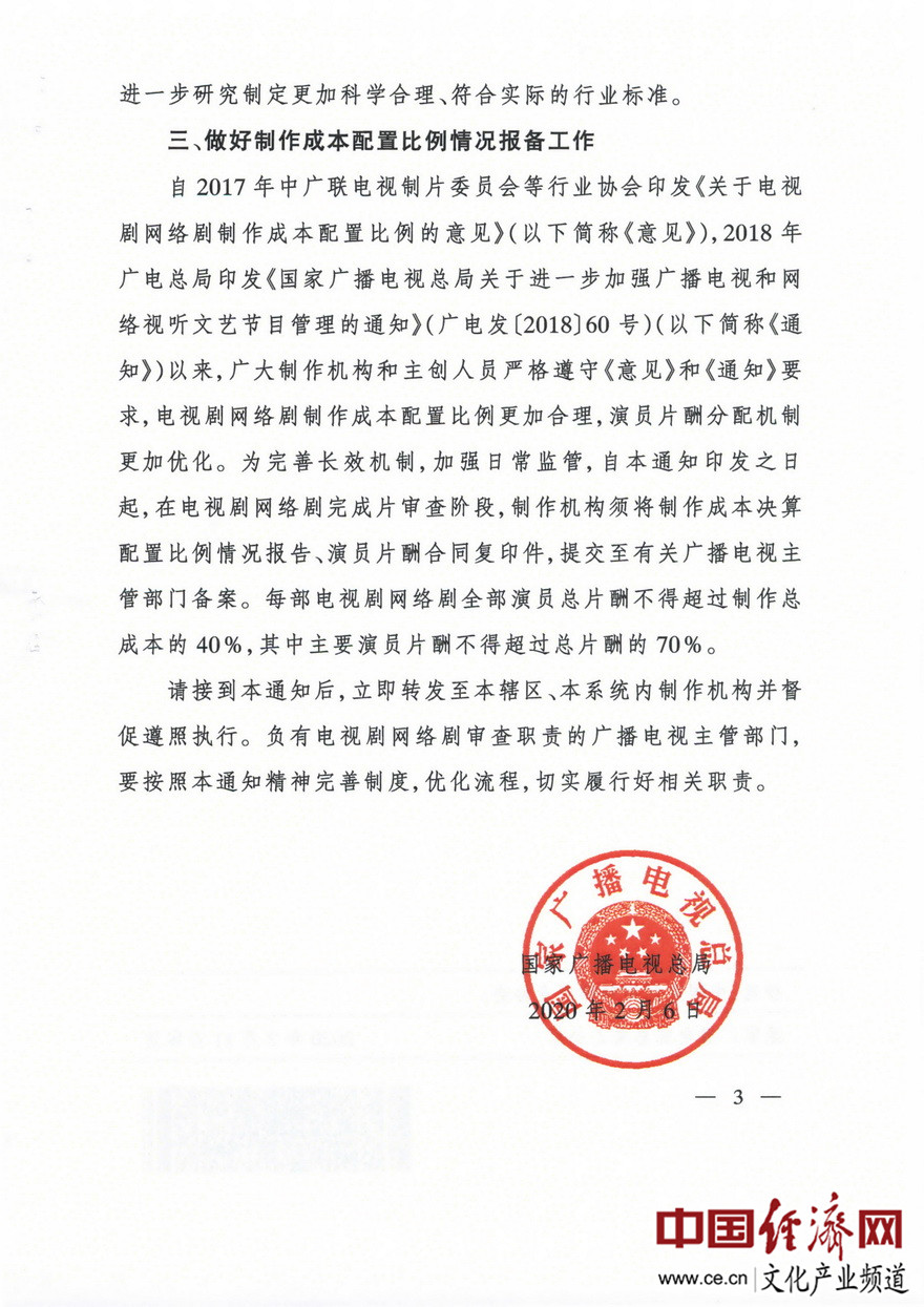 經(jīng)濟(jì)日?qǐng)?bào)-中國(guó)經(jīng)濟(jì)網(wǎng)北京2月20日訊 近日,國(guó)家廣播電視總局下發(fā)了《進(jìn)一步加強(qiáng)電視劇網(wǎng)絡(luò)劇創(chuàng)作生產(chǎn)管理有關(guān)工作的通知》(廣電發(fā)﹝2020﹞10號(hào))。據(jù)經(jīng)濟(jì)日?qǐng)?bào)-中國(guó)經(jīng)濟(jì)網(wǎng)文化產(chǎn)業(yè)頻道(微信號(hào):cewenhua)了解,該《通知》要求:一是加強(qiáng)源頭引導(dǎo),在申報(bào)備案公示時(shí),制作機(jī)構(gòu)須向省局承諾已基本完成劇本創(chuàng)作;二是反對(duì)內(nèi)容“注水”,電視劇網(wǎng)絡(luò)劇拍攝制作提倡不超過40集,鼓勵(lì)30集以內(nèi)短劇創(chuàng)作;三是做好制作成本配置比例情況報(bào)備工作。在電視劇網(wǎng)絡(luò)劇完成片審查階段,制作機(jī)構(gòu)須將制作成本決算配置比例情況報(bào)告、演員片酬合同復(fù)印件,提交至省局備案。每部電視劇網(wǎng)絡(luò)劇全部演員總片酬不得超過制作總成本的40%,其中主要演員片酬不得超過總片酬的70%。>>>更多政策可查看中國(guó)經(jīng)濟(jì)網(wǎng)“中國(guó)文化產(chǎn)業(yè)政策庫(kù)”
