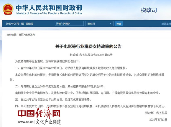 財政部、稅務(wù)總局:2020年免征文化事業(yè)建設(shè)費 免征電影放映服務(wù)增值稅