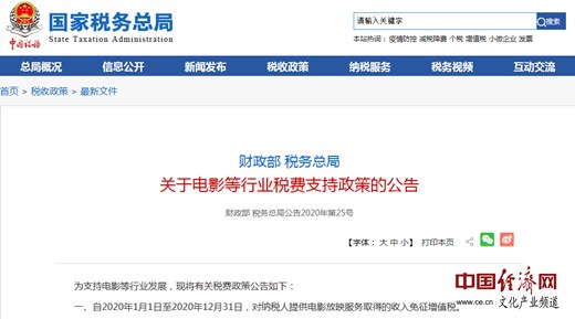 經(jīng)濟(jì)日報(bào)-中國經(jīng)濟(jì)網(wǎng)北京5月20日訊 近日,國家稅務(wù)總局官網(wǎng)發(fā)布《關(guān)于電影等行業(yè)稅費(fèi)支持政策的公告》(以下簡稱《公告》),支持電影等行業(yè)發(fā)展。