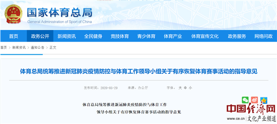 經(jīng)濟(jì)日報-中國經(jīng)濟(jì)網(wǎng)北京6月3日訊 近日,國家體育總局發(fā)布了《體育總局統(tǒng)籌推進(jìn)新冠肺炎疫情防控與體育工作領(lǐng)導(dǎo)小組關(guān)于有序恢復(fù)體育賽事活動的指導(dǎo)意見》(以下簡稱“意見”),意見指出,采取預(yù)約、限流等方式,有序開放各類運(yùn)動場所。  >>>更多政策可查看中國經(jīng)濟(jì)網(wǎng)“中國文化產(chǎn)業(yè)政策庫”