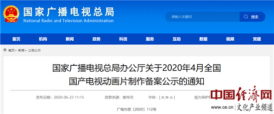 經(jīng)濟(jì)日?qǐng)?bào)-中國(guó)經(jīng)濟(jì)網(wǎng)北京6月24日訊 近日,國(guó)家廣播電視總局辦公廳發(fā)布了《國(guó)家廣播電視總局辦公廳關(guān)于2020年4月全國(guó)國(guó)產(chǎn)電視動(dòng)畫(huà)片制作備案公示的通知》(以下簡(jiǎn)稱“通知”),通知指出,2020年4月共有45部國(guó)產(chǎn)電視動(dòng)畫(huà)片獲得備案。