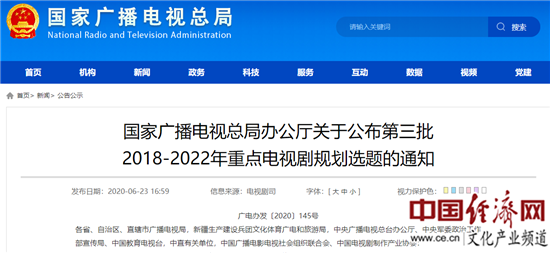 經(jīng)濟(jì)日?qǐng)?bào)-中國(guó)經(jīng)濟(jì)網(wǎng)北京6月24日訊 近日,國(guó)家廣播電視總局辦公廳發(fā)布了《國(guó)家廣播電視總局辦公廳關(guān)于公布第三批2018-2022年重點(diǎn)電視劇規(guī)劃選題的通知》(以下簡(jiǎn)稱(chēng)“通知”),通知公布了2018-2022年重點(diǎn)電視劇規(guī)劃選題,共計(jì)100部?!豆住贰堕}寧鎮(zhèn)》《大國(guó)擔(dān)當(dāng)》等作品確定為此次重點(diǎn)電視劇規(guī)劃選題。