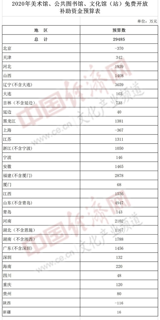 經(jīng)濟(jì)日報(bào)-中國經(jīng)濟(jì)網(wǎng)北京8月4日訊 8月4日,財(cái)政部官網(wǎng)發(fā)布了《關(guān)于下達(dá)2020年美術(shù)館、公共圖書館、文化館(站)免費(fèi)開放補(bǔ)助資金預(yù)算的通知》(以下簡稱“通知”),據(jù)通知附件《2020年美術(shù)館、公共圖書館、文化館(站)免費(fèi)開放補(bǔ)助資金預(yù)算表》顯示,2020年美術(shù)館、公共圖書館、文化館(站)免費(fèi)開放補(bǔ)助資金預(yù)算為2.9485億。