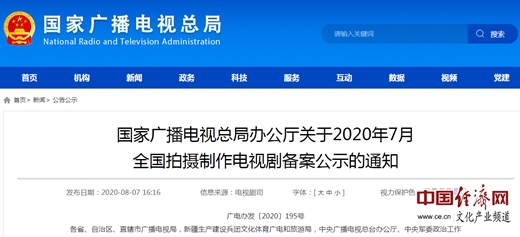 經(jīng)濟(jì)日報(bào)-中國經(jīng)濟(jì)網(wǎng)北京8月10日訊 近日,國家廣播電視總局公布7月份全國拍攝制作電視劇備案公示情況,據(jù)悉,2020年7月,全國電視劇拍攝制作備案公示的劇目共49部、1640集。