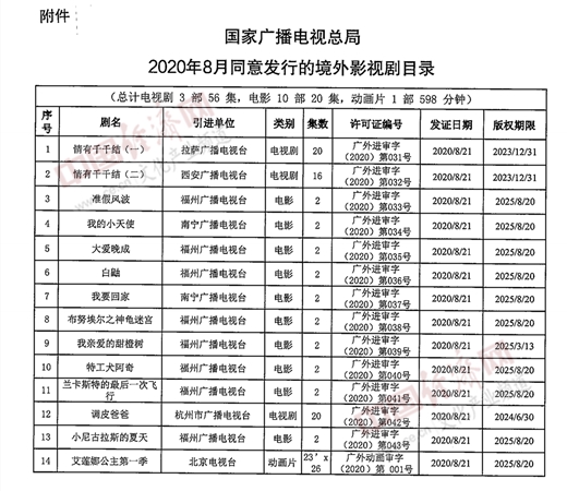 經(jīng)濟日報-中國經(jīng)濟網(wǎng)北京9月24日訊 近日,國家廣播電視總局辦公廳公布2020年8月全國引進境外影視劇有關(guān)情況,《我的小天使》《大愛晚成》等10部電影及《情有千千結(jié)》等3部電視劇作品入選《2020年8月同意發(fā)行的境外影視劇目錄》。