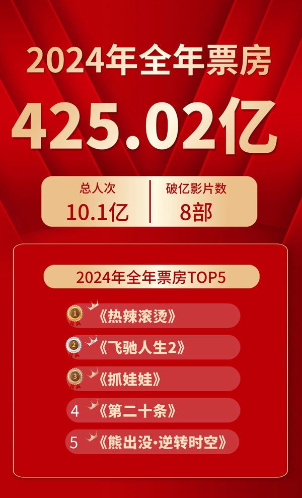 據(jù)貓眼專業(yè)版數(shù)據(jù),2024年全年共有8部影片破10億,年度票房冠軍為春節(jié)檔影片《熱辣滾燙》,全年大盤占比為8.1%。年度TOP10影片分別為《熱辣滾燙》《飛馳人生2》《抓娃娃》《第二十條》《熊出沒·逆轉(zhuǎn)時空》《默殺》《志愿軍:存亡之戰(zhàn)》《年會不能停!》《哥斯拉大戰(zhàn)金剛2:帝國崛起》《你想活出怎樣的人生》,其中,國產(chǎn)片占據(jù)八席,進口片占據(jù)兩席,涵蓋類型包括喜劇、劇情、犯罪、戰(zhàn)爭、動作、動畫等。整體看來,2024年電影市場仍呈現(xiàn)出較強的韌性和上升空間。