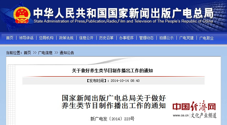 中國(guó)經(jīng)濟(jì)網(wǎng)北京10月22日訊 中國(guó)經(jīng)濟(jì)網(wǎng)文化產(chǎn)業(yè)頻道記者從國(guó)家新聞出版廣電總局網(wǎng)站獲悉,近日,國(guó)家新聞出版廣電總局針對(duì)養(yǎng)生類節(jié)目存在夸張宣傳、廣告植入等問(wèn)題下發(fā)通知,規(guī)范養(yǎng)生類節(jié)目播出秩序。通知要求,電視養(yǎng)生類節(jié)目只能由電視臺(tái)策劃制作,不得由社會(huì)公司制作,并嚴(yán)禁以變相形式發(fā)布廣告等。以下為通知全文。