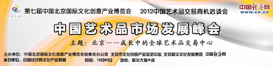 目前,北京藝術(shù)品市場在全球格局中將處于怎樣的定位?藝術(shù)品的稅收問題如何解決?中國藝術(shù)品經(jīng)營及研究機構(gòu)面臨哪些機遇和挑戰(zhàn)?文化保稅區(qū)的政策優(yōu)勢如何能促進(jìn)北京藝術(shù)品交易市場的發(fā)展?作為2012第七屆中國北京國際文化創(chuàng)意產(chǎn)業(yè)博覽會重要的活動之一,由北京文化創(chuàng)意產(chǎn)業(yè)促進(jìn)中心、北京歌華文化發(fā)展集團和中國經(jīng)濟網(wǎng)共同主辦,中國經(jīng)濟網(wǎng)文化產(chǎn)業(yè)頻道承辦的“2012中國藝術(shù)品市場發(fā)展峰會”將于12月在北京舉行,特邀請政府相關(guān)部門及各方人士針對目前北京藝術(shù)品市場發(fā)展現(xiàn)狀和發(fā)展趨勢進(jìn)行直接的交流對話。