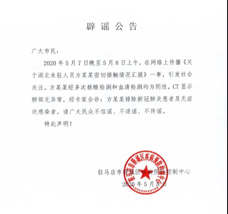 據(jù)駐馬店市驛城區(qū)委宣傳部官微消息,2020年5月7日晚至5月8日上午,在網(wǎng)絡(luò)上傳播《關(guān)于湖北來駐人員方某某密切接觸情況匯報》一事,引發(fā)社會關(guān)注。對此,駐馬店市驛城區(qū)疾病預(yù)防控制中心表示,方某某經(jīng)多次核酸檢測和血清檢測均為陰性,CT顯示肺部無異常,經(jīng)專家會診:方某某排除新冠肺炎患者及無癥狀感染者。請廣大民眾不信謠、不造謠、不傳謠。