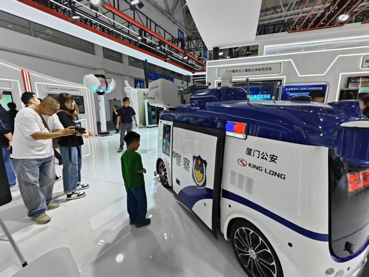 頭頂無人機(jī)、肚藏機(jī)器狗……集多種科技于一身的無人安防警車吸引了小朋友的目光。 中國經(jīng)濟(jì)網(wǎng)記者梁木攝