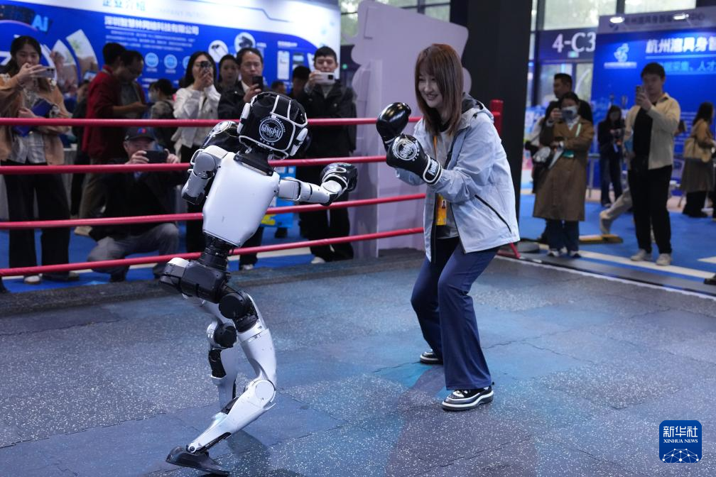 11月6日,觀(guān)眾在2025年世界互聯(lián)網(wǎng)大會(huì)“互聯(lián)網(wǎng)之光”博覽會(huì)現(xiàn)場(chǎng)體驗(yàn)與宇樹(shù)科技G1機(jī)器人“格斗”。新華社記者 黃宗治 攝