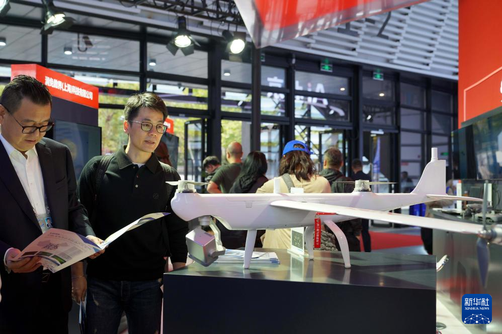 11月6日,嘉賓在觀(guān)看可提供空中巡檢服務(wù)的“道通龍魚(yú) Pro”垂直起降固定翼。新華社記者趙宇思攝
