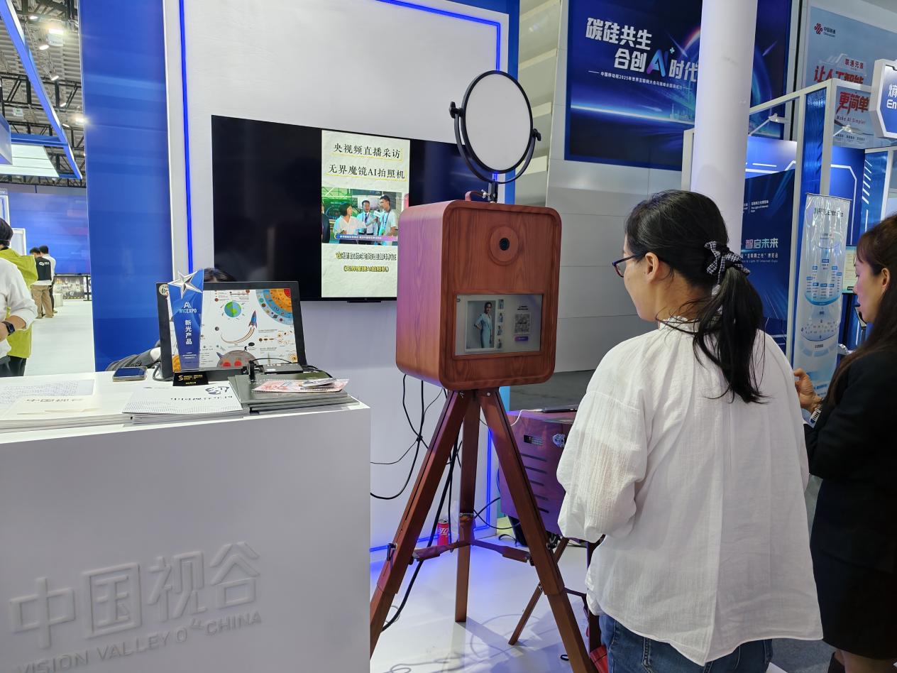 觀眾體驗中國視谷的無界魔鏡AI拍照機,其內(nèi)置數(shù)百款風(fēng)格迥異的寫真模板,依托AI視覺大模型,具備強大的影像生成能力。中國經(jīng)濟網(wǎng)記者李方/攝