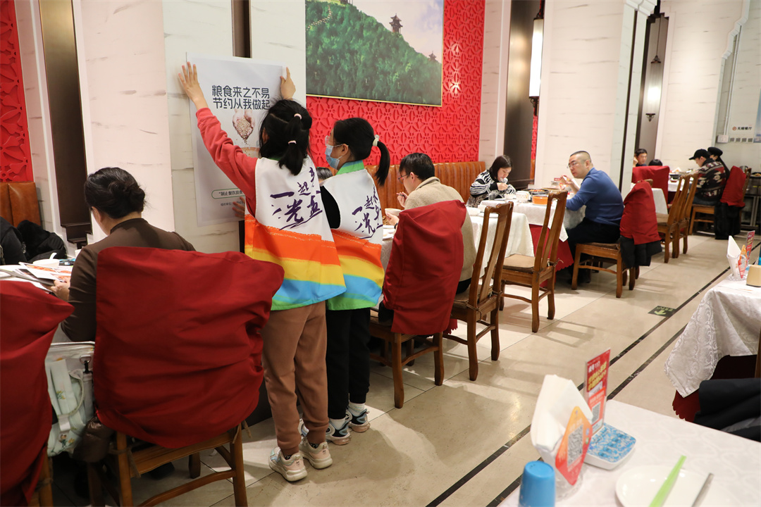 活動(dòng)中,七名“制止餐飲浪費(fèi)”青少年志愿者將宣傳海報(bào)張貼在餐廳顯著位置。