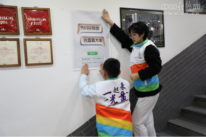 活動中,“制止餐飲浪費”青少年志愿者們首先將宣傳節(jié)約糧食、反對浪費的標(biāo)語海報張貼在餐廳顯著位置。