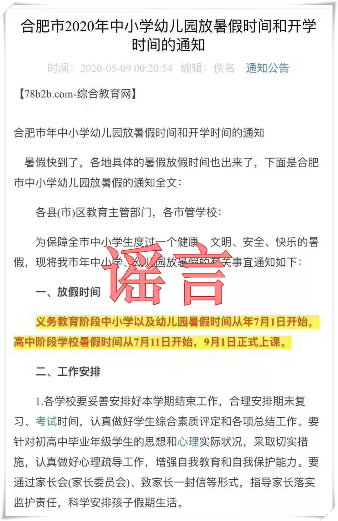 據(jù)合肥市教育局官微,5月9日,一則題為“合肥市2020年中小學幼兒園放暑假時間和開學時間的通知”的消息在網(wǎng)絡(luò)上傳播,消息顯示“義務(wù)教育階段中小學以及幼兒園暑假時間從7月1日開始,高中階段學校暑假時間從7月11日開始,9月1日正式上課?!苯?jīng)核實,合肥市教育局此前未發(fā)布過相關(guān)公告,該則消息為謠言。