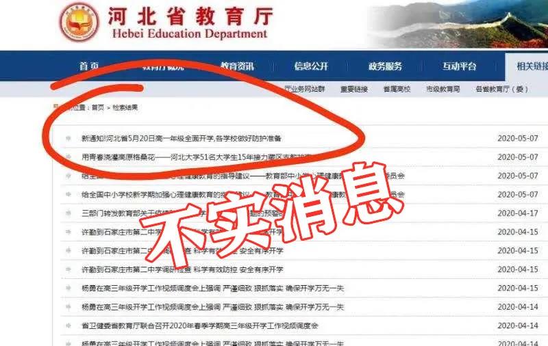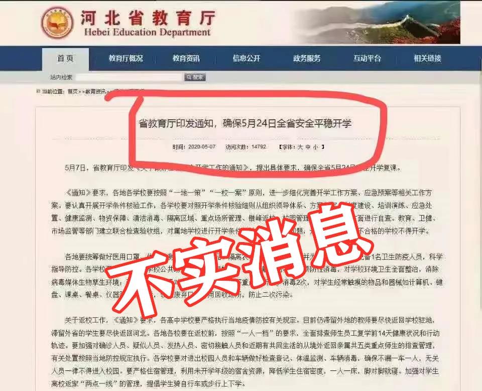 據(jù)河北省互聯(lián)網(wǎng)信息辦公室官微,網(wǎng)傳截圖“河北5月24日全省開學”和 “5月20日高一年級全面開學”等通知均為不實消息。