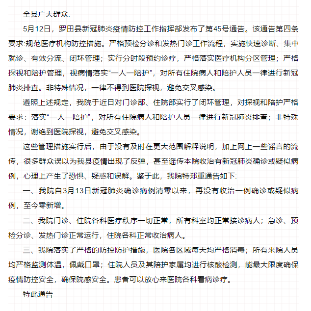 針對近日湖北羅田縣人民醫(yī)院收治新冠肺炎確診病例等傳言,5月22日,羅田縣人民醫(yī)院發(fā)布《關(guān)于本院疫情防控和醫(yī)療秩序一切正常的通告》辟謠稱,該院自3月13日新冠肺炎確診病例清零以來,再沒有收治一例確診或疑似病例,至今零新增。目前,該院門診、住院各科醫(yī)療秩序一切正常,所有科室均正常接診病人;急診、預(yù)檢分診、發(fā)熱門診正常運(yùn)行,住院各科正常收治病人。