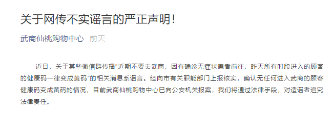 據(jù)武商仙桃購物中心管理有限公司官微5月23日消息,近日,關(guān)于某些微信群傳播“近期不要去武商,因有確診無癥狀患者前往,昨天所有時(shí)段進(jìn)入的顧客的健康碼一律變成黃碼”的相關(guān)消息系謠言。經(jīng)向市有關(guān)職能部門上報(bào)核實(shí),確認(rèn)無任何進(jìn)入武商的顧客健康碼變成黃碼的情況,目前武商仙桃購物中心已向公安機(jī)關(guān)報(bào)案,將通過法律手段,對造謠者追究法律責(zé)任。