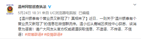 據(jù)@溫州網(wǎng)警巡查執(zhí)法5月24日消息,從鹿城區(qū)疾控中心獲悉,網(wǎng)傳“溫州銀泰有營業(yè)員感染新冠病毒”系謠言。請廣大網(wǎng)友從官方權(quán)威渠道獲取信息,不造謠,不傳謠,不信謠。