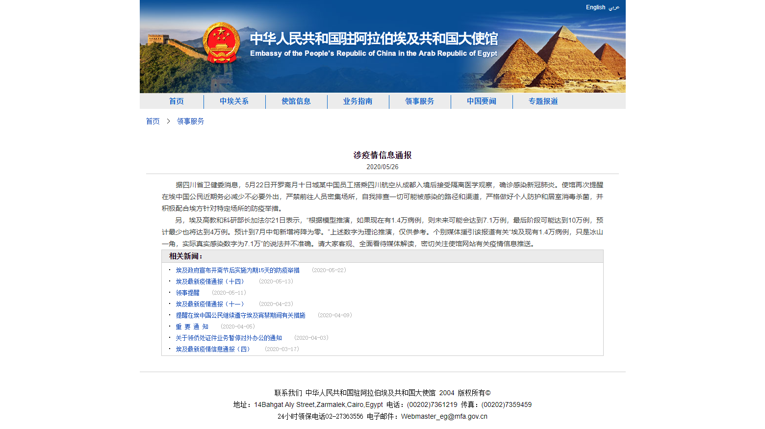 此外,駐埃大使館提醒,據(jù)四川省衛(wèi)健委消息,5月22日開(kāi)羅齋月十日城某中國(guó)員工搭乘四川航空從成都入境后接受隔離醫(yī)學(xué)觀察,確診感染新冠肺炎。使館再次提醒在埃中國(guó)公民近期務(wù)必減少不必要外出,嚴(yán)禁前往人員密集場(chǎng)所,自我排查一切可能被感染的路徑和渠道,嚴(yán)格做好個(gè)人防護(hù)和居室消毒殺菌,并積極配合埃方針對(duì)特定場(chǎng)所的防疫舉措。