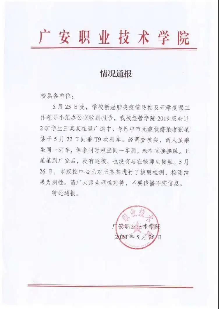 公告稱, 5月25日晚,廣安職業(yè)技術(shù)學(xué)院新冠肺炎疫情防控及開學(xué)復(fù)課工作領(lǐng)導(dǎo)小組辦公室收到報告,該校經(jīng)管學(xué)院2019級會計2班學(xué)生王某某在返廣(安)途中,與巴中市無癥狀感染者張某某于5月22日同乘T9次列車。經(jīng)調(diào)查核實,兩人雖乘坐同一列車,但未同時乘坐同一車廂,未有直接接觸。王某某到廣安后,沒有返校,也沒有與在校師生接觸。5月26日,廣安市疾控中心對王某某進(jìn)行核酸檢測,檢測結(jié)果為陰性。